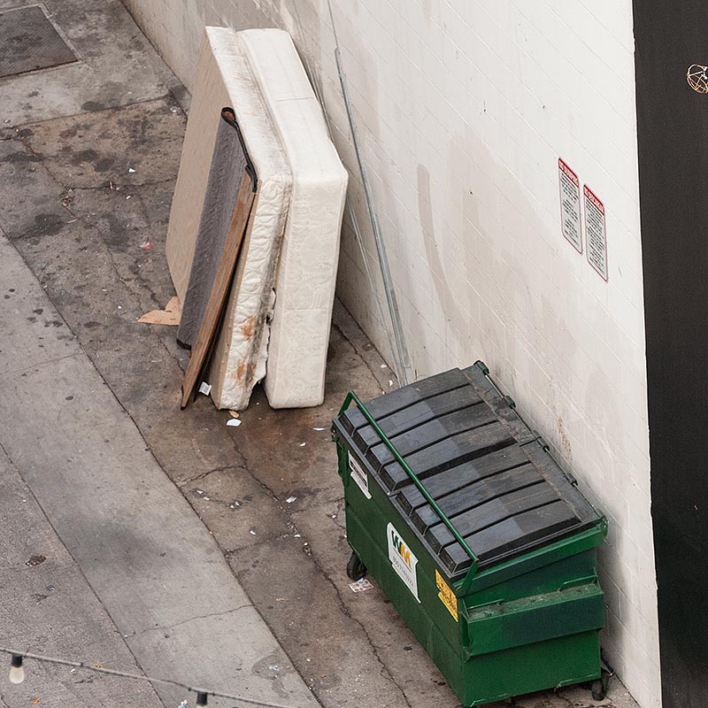 When I moved into the Center Street Lofts building in October 2014, one of the selling points not mentioned on the property listing was a view of  the chronic trash problem in the alley adjacent to and caused by the Cabrillo Hotel building, its tenants, and its managment. I was astonished by the quantity of mattresses and furniture that would appear in the alley next to the Cabrillo. For my own amusement I started documenting the constant parade of beds and fold-out couches. I assumed that the building was owned by an individual with a slum lord mentality and this kind of management was all that would be expected from the owner of a transient hotel. As I became familiar with the neighborhood, I learned that the owner of the property was also the president of the local Business Improvement District, and that he was relying on PBID funded services on a regular basis to clean up after his property.
